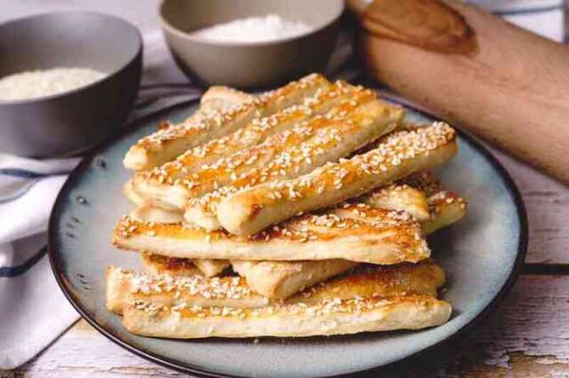 Исечете го тестото на долги ленти широки околу 1 сантиметар, потоа нежно расукајте ги и обликувајте ги во тенки стапчиња. Наредете ги во плех обложен со хартија за печење, премачкајте ги со масло и наросете ги со сусам. Печете околу 20 минути на 180 степени додека не поруменат и не станат крцкави.